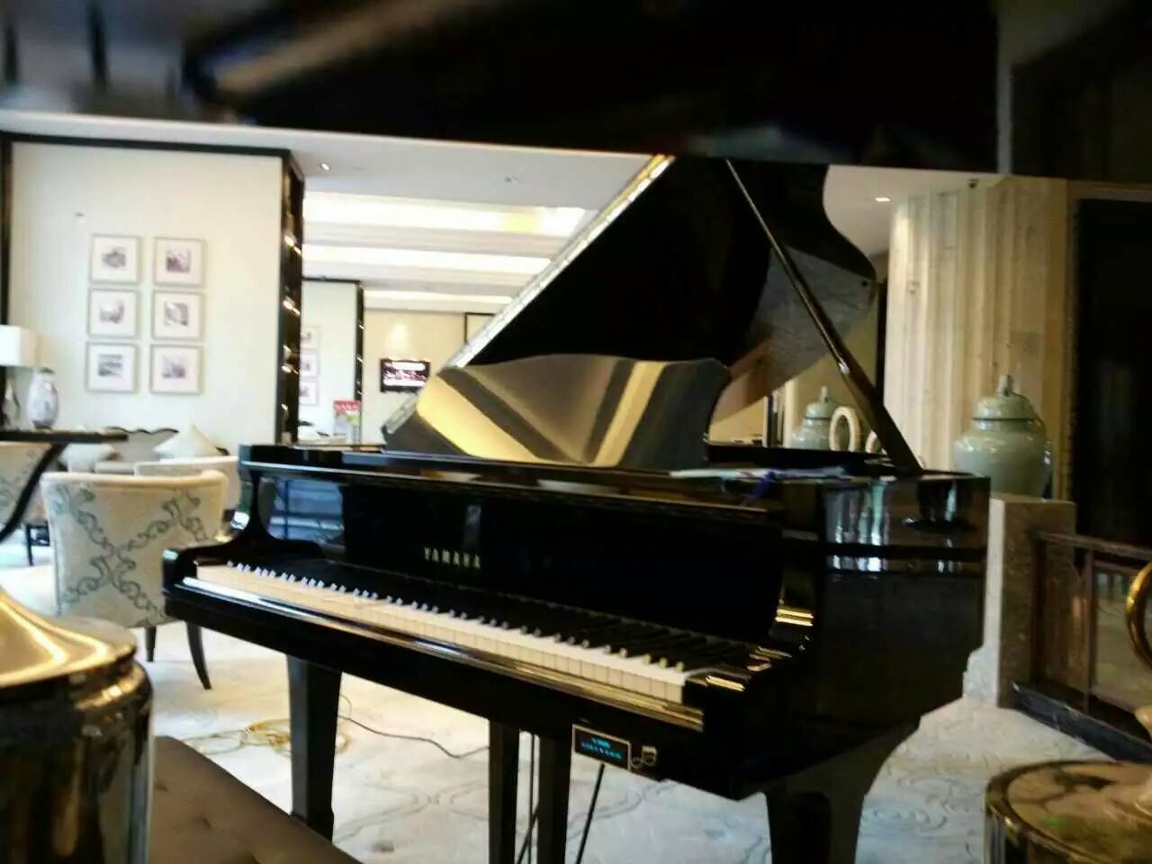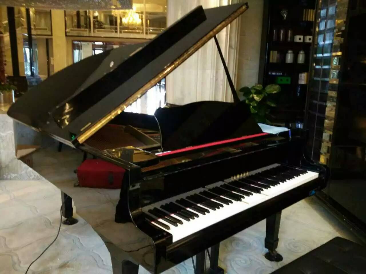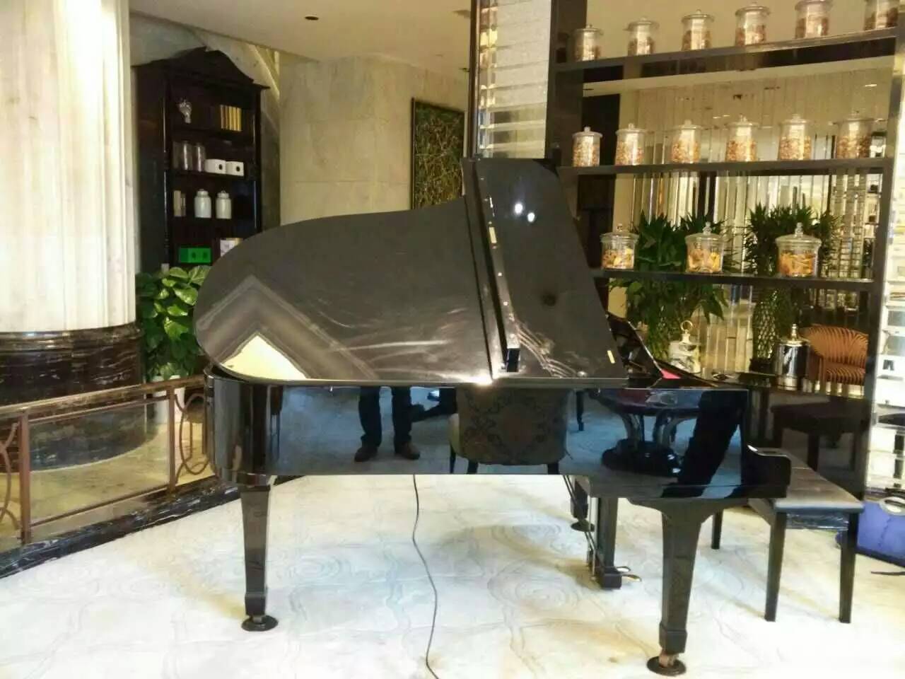 华美达酒店到了一台雅马哈三角琴,安装完自动演奏系统,我们的蓝屏配上去好看不少